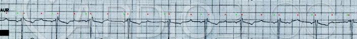 Jól látható, hogy a középsőhöz képest az első végét és az utolsó elejét torzítja a bal alsó pitvari kiindulású P'. Ha elkezdünk méricskélni, és a jól látható P'-P' távolságokat megfelezzük, rendre vagy a QRS-be esően, vagy annak elejét vagy végét torzítóan egy ~120/min frekvenciájú aktivitást láthatunk. Tehát ez nem egy bigeminia és nem lehet szó járulékos kötegen visszavezetődő aktivitásról sem, hiszen egy P-re két P' jut, az utolsó QRS előtti P-P' reláció pedig a P-k és a P'-k disszociáltságát is jelzi. Ez nem más, tehát, mint egy bal alsó pitvari blokkolt parasystolia.