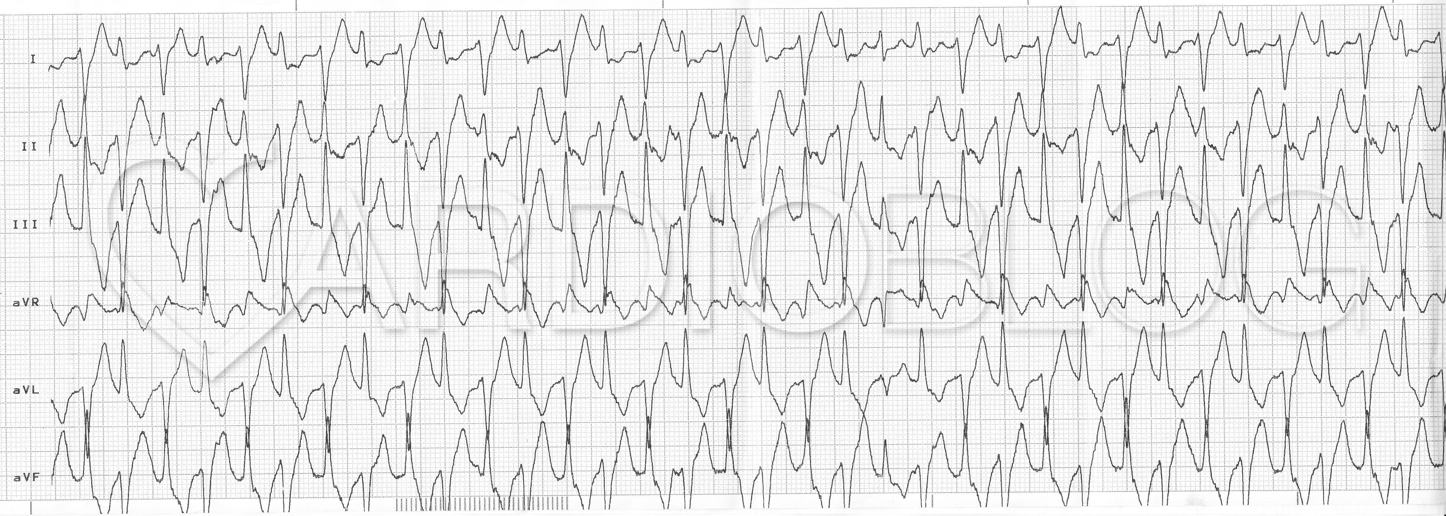 Egy váltakozó tengelyállású kb. 180 frekvenciájú ritmusos széles QRS tachycardia van. A QRS-ek szélessége kb. 120-130 ms.