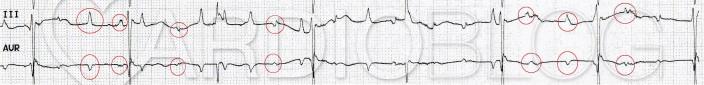 A "hamarabb", nem regulárisan érkező QRS-ek tehát a saját, levezetett QRS-ek. Ezek a junkcionális pótritmussal szemben azonban inkomplett JTSZB+ bal posterior haemiblokk(BPH)-szerű morfológiájúak. A harmadik regisztrátumon szinte csak ezt látjuk. Itt a P hullámok is kisebb változatosságban vannak jelen.