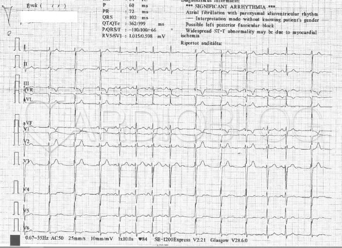 A regisztrátum közepén és vége felé egyértelmű, tachycard sinus P-ket látunk (a fiatal, edzett) emberekre jellemző inkomplett JTSZB-kal levezetve, egyéb eltérés nélkül. Ezeket a szakaszokat más morfológiájú, regulárisan érkező QRS-ek hármas sorozata szakítja meg úgy, hogy látszólag hiányoznak a P-hullámok. Az automata elemző így jogosan véleményezi, hogy "*** SIGNIFICANT ARRHYTHMIA ***", illetve érthető, hogy miért is gondolhat pitvarfibrillációra.