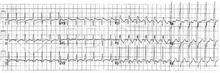 Ahogyan korábban már többször volt róla szó a blogon, bátran húzzuk az ujjunkat a görbén, és keressük a "hibát a sormintában"! Ha most is így jártunk el, akkor kiszúrhattuk, hogy egy ízben a QRS-t nem követi rertográd P, de a reguláris, széles QRS tachycardia fennmarad, nem terminálódik. Íme: