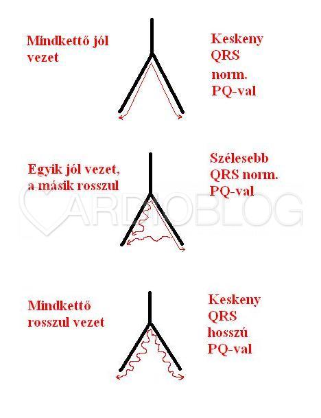 A könnyebb követhetőség céljából, egyszerűsítve, a trifascicularis rendszer helyett most csak egy két szárból álló modellt vizsgáljunk! Ha az egyik szár jól vezet és a másik gyengébben, akkor az az oldal, ahol jó az ingerületvezetés izomvezetéssel "besegít" a másik oldalnak abban, hogy ott is történjék aktiváció. A lassabb izomvezetés a QRS kiszélesedéséhez vezet. (A QRS szélessége azt reprezentálja, hogy mennyi idő telik el az első kamrai izomrost aktivációjától az utolsó aktivációjáig.) Abban az esetben azonban, amikor mindkettő szár rosszul vezet és a vezetésük "éppen ugyanannyira" rossz, akkor egyik oldal sem segít be a másiknak. Nem lesz izomvezetés. A QRS keskeny marad, azonban az az idő, ami eltelik az első pitvari izomrost aktivációjától az első kamrai izomrost aktivációjáig (ez a PQ-távolság) azonban látványosan megnyúlik.