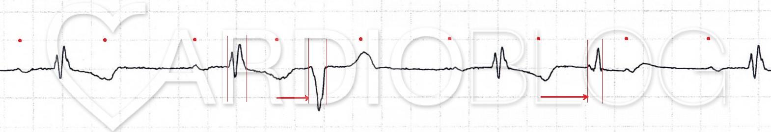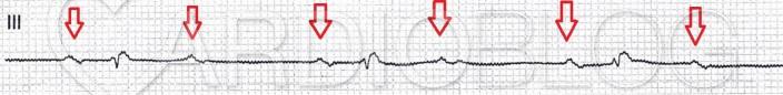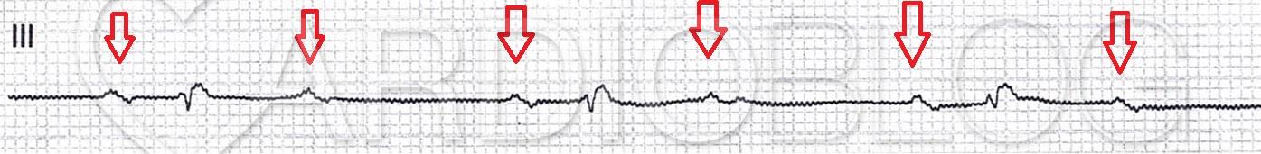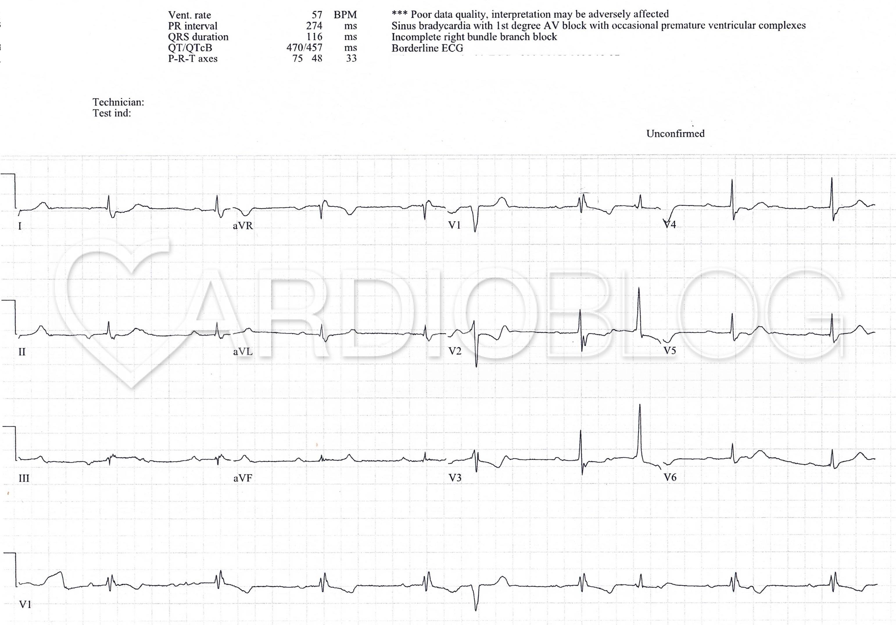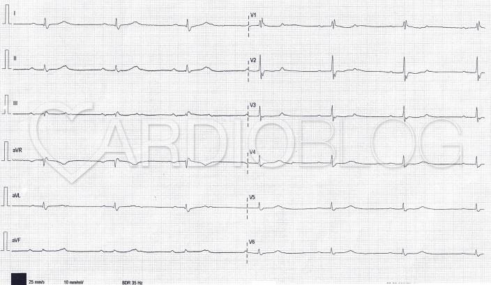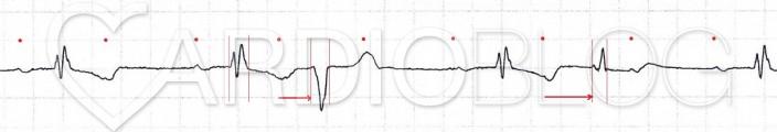 Korábban például ebben a feladványban találkozhattunk hasonlóval. Mindezek alapján tehát - teoretikusan - az is elképzelhető lenne, hogy egy súlyos, mindkét (mindhárom) szárra kiterjedő ingerületvezetési zavar összesen egy jelentősen megnyúlt PQ-ban mutatkozik meg. Ezt így, tisztán sosem fogjuk látni. A QRS-ek szélessége és a PQ távolság "csúszkálni" fog.