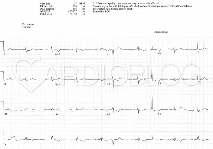 Mindezek alapján következtethetnénk arra, hogy a blokk proximálisan van és - maior tünet hiányában - a beteg nem feltétlenül igényel monitorozást az állandó pacemaker beültetéséig. Ha megnézzük azonban a QTc-t, akkor arra juthatunk, hogy az vészesen megnyúlt (QT eléri a 600 ms,t a QTc pedig meghaladja az 570 ms-t), ami  -főként extrasystolék esetén vagy változó blokkarány, következményesen változó RR távolságok és QTc esetén - torsades de pointes kamrai tachycardiára hajlamosít. Ennek mechanizmusáról korábban ebben a korábbi feladványban olvashattunk.