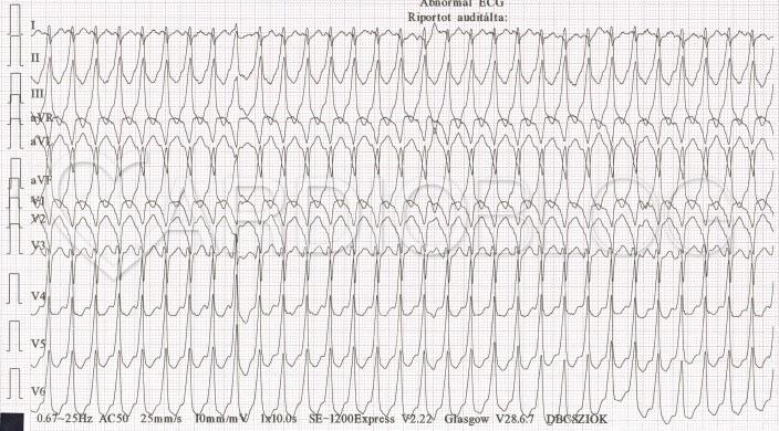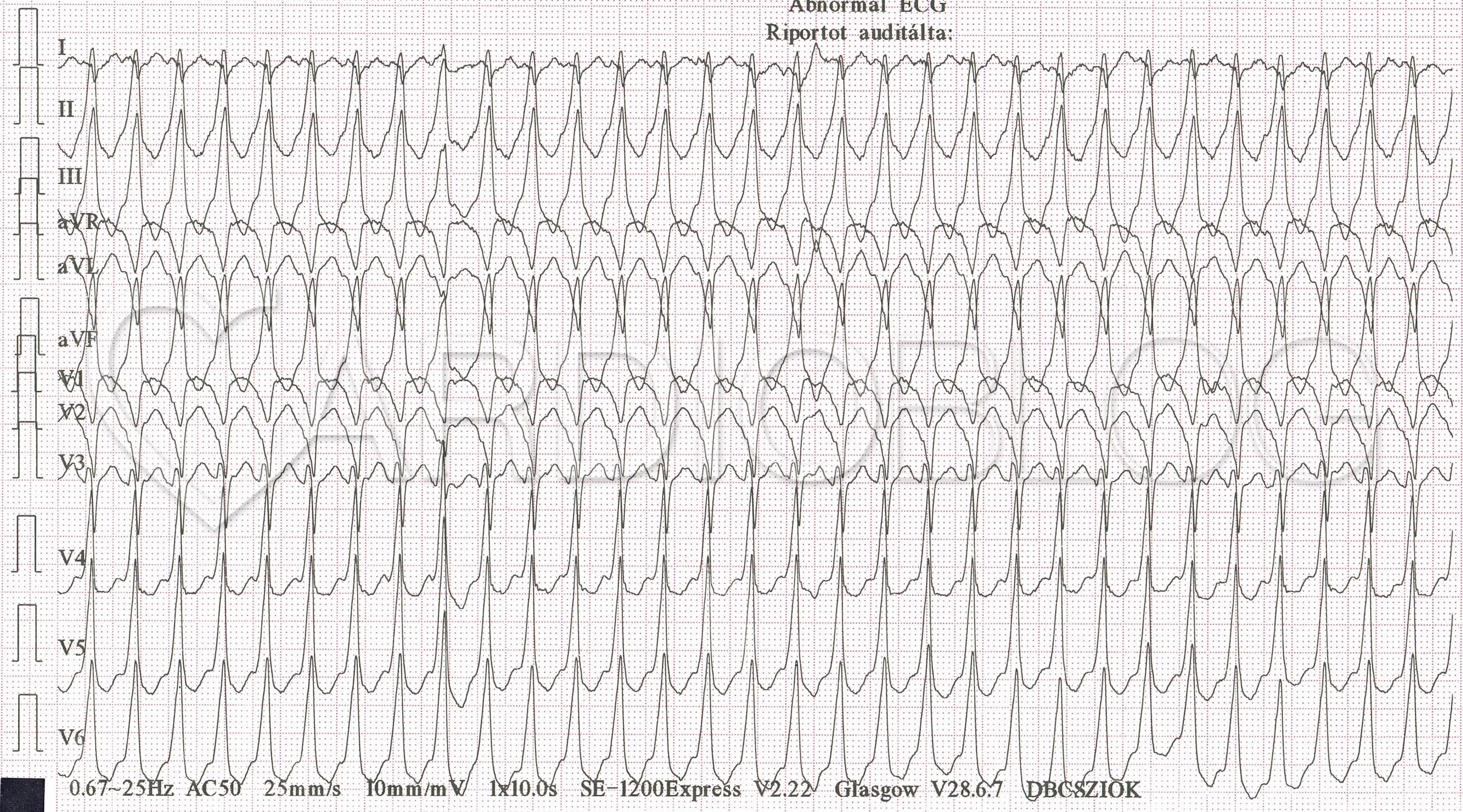 Aki eddig nem vette volna észre a hibát a sormintában, házi feladat, azt megtalálni! Az eltérő morfológiájú QRS legvalószínűbb magyarázata a VT alatt aktuálisan, hogy az fúziós ütés.